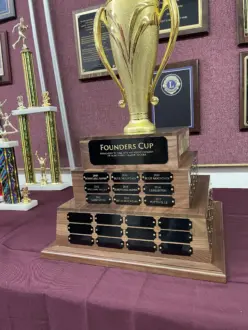 The Founder’s Cup (see accompanying photos), which was built by ET Trophy Shop in Pottsville, resembles the NHL’s Stanley Cup. It will be a traveling trophy, kept by that season’s champion for one year. It honors the legacy of the league with a plate for each champion dating back to the league’s first varsity campaign in 1991.