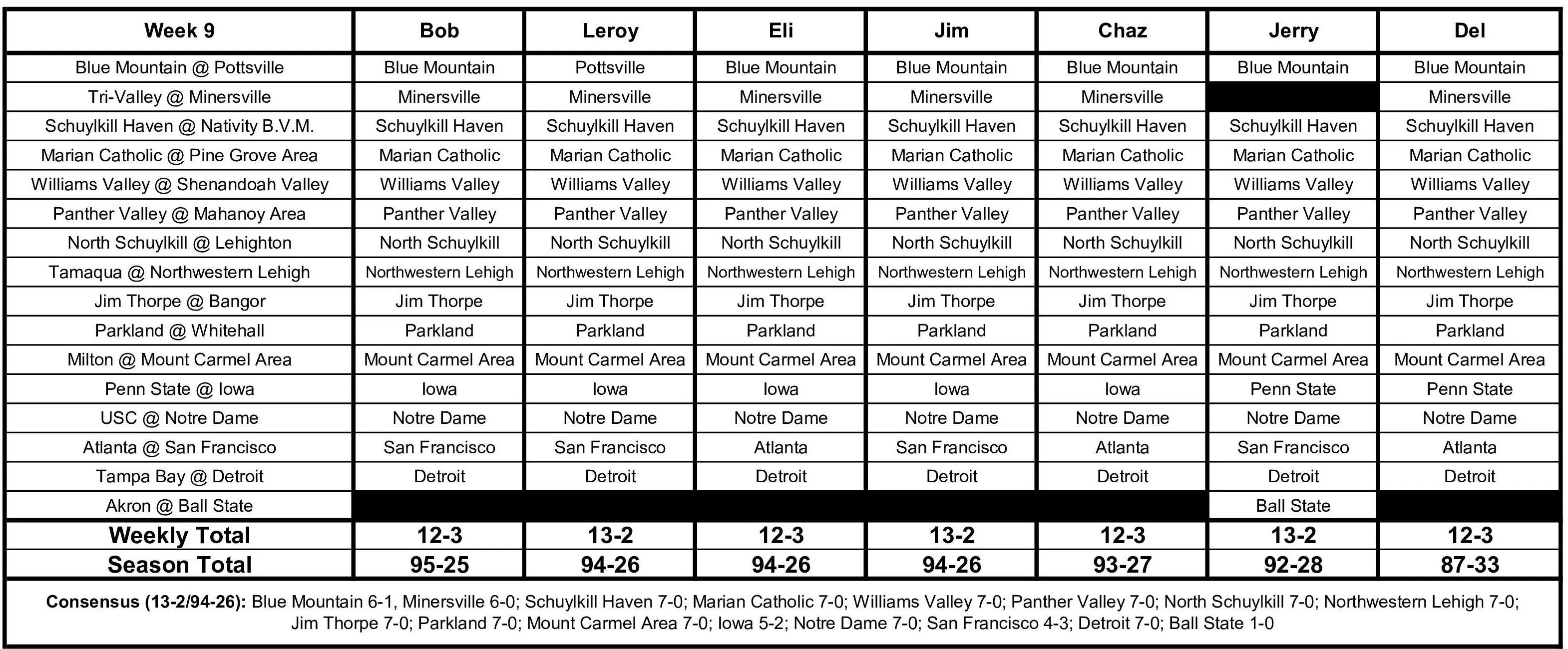 HIGH SCHOOL FOOTBALL, WEEK 9, Friday's scores --- Blue Mountain 49, Pottsville 14 F (WPPA) .... Minersville 34, Tri-Valley 17 F (T-102) .... Schuylkill Haven 57, Nativity 0 F .... Marian 35, Pine Grove 0 F .... Williams Valley 55, Shenandoah Valley 6 F .... Panther Valley 20, Mahanoy Area 0 F .... North Schuylkill 36, Lehighton 14 F .... Northwestern Lehigh 56, Tamaqua 16 F .... Jim Thorpe 35, Bangor 21
