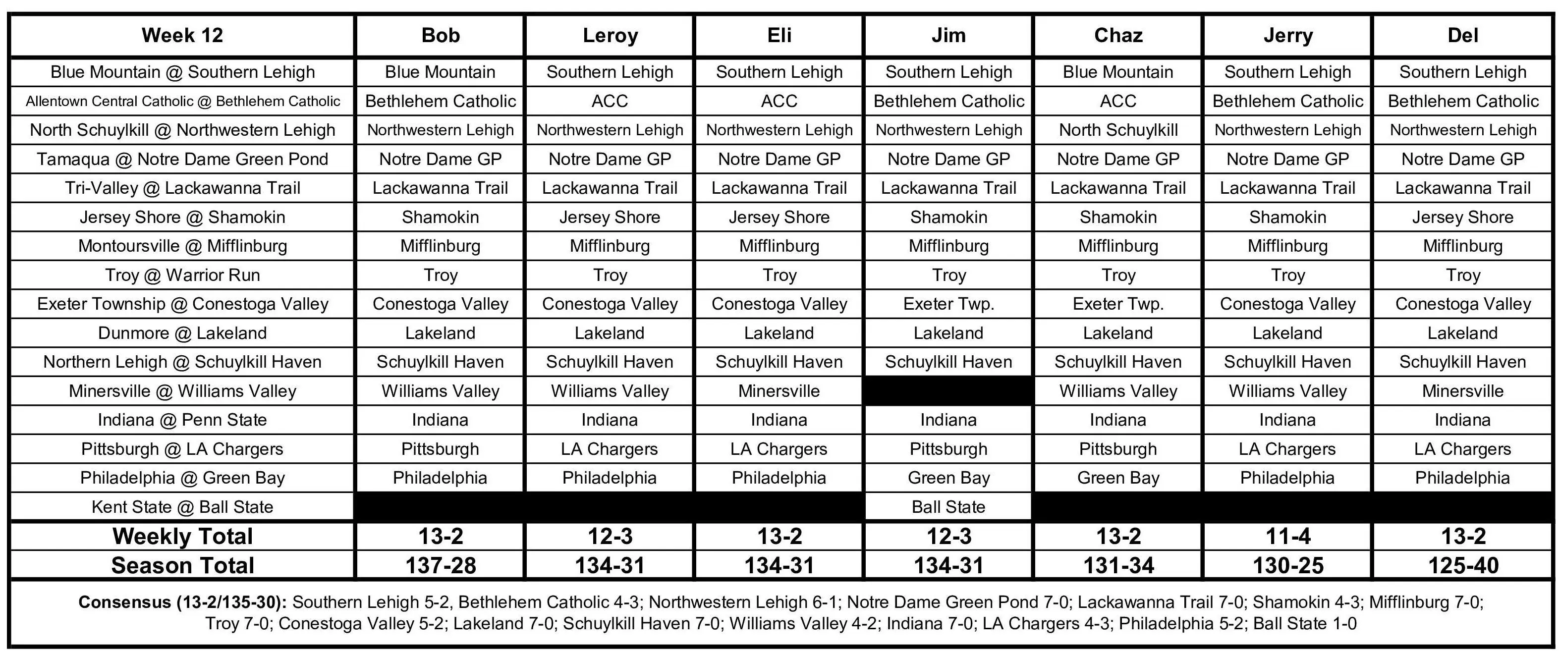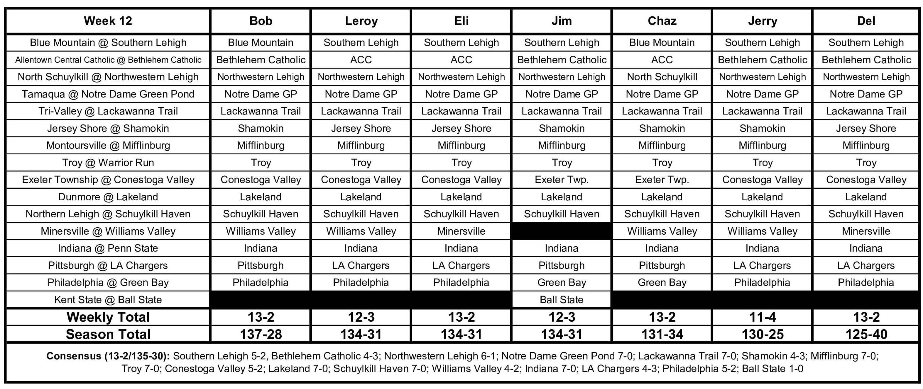 HIGH SCHOOL FOOTBALL, WEEK 12, Thursday's score --- District 11 Class 4A Semifinal: Southern Lehigh 55, Blue Mountain 14 F (T-102) .... Friday's games --- District 2/11 Class A Subregional Championship: Tri-Valley at Lackawanna Trail, 7 p.m. .... District 11 Class 3A Semifinals: Tamaqua vs. Notre Dame-Green Pond, Lafayette College, 7:10 p.m. .... North Schuylkill at Northwestern Lehigh, 7:10 p.m. (T-102) .... Saturday's games --- District 11 Class AA Semifinals: Northern Lehigh at Schuylkill Haven, 6 p.m. (WPPA) .... Minersville at Williams Valley, 6 p.m. (T-102)