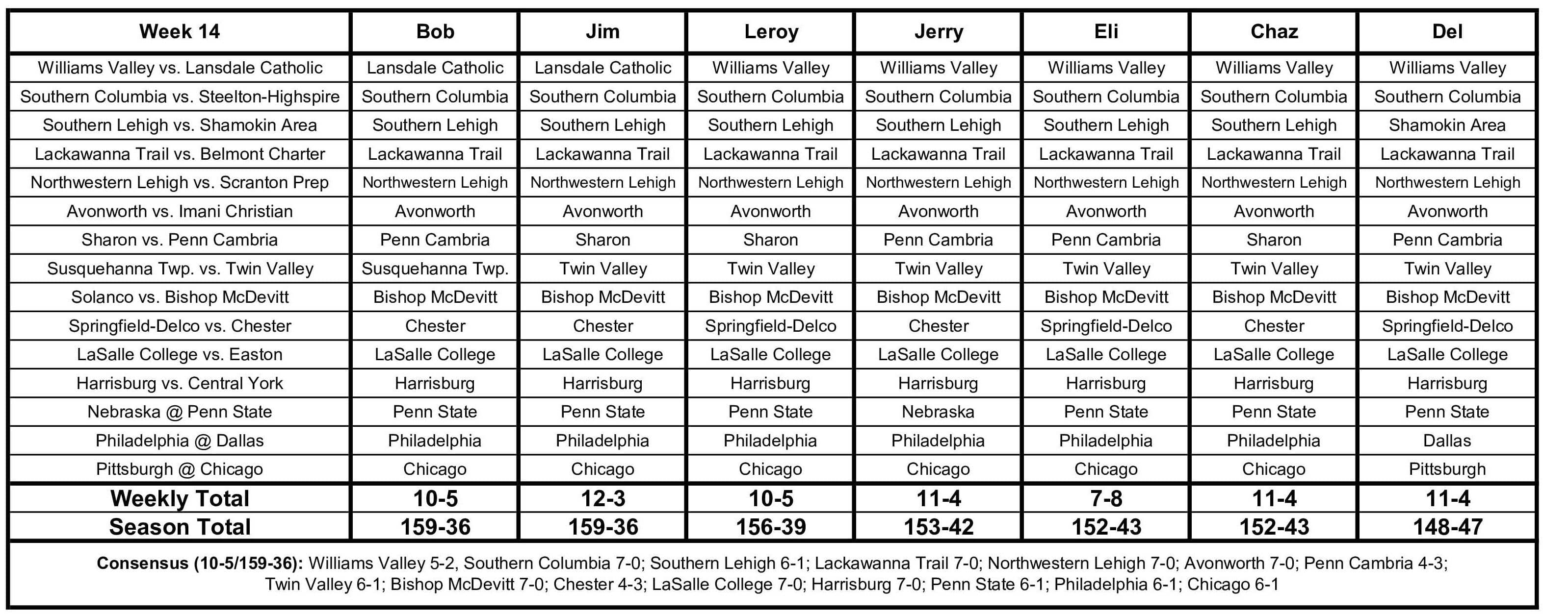 HIGH SCHOOL FOOTBALL, WEEK 14, Friday's score --- PIAA Class AA Quarterfinal: Lansdale Catholic 33, Williams Valley 7 F (T-102)