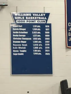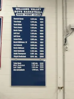 Williams Valley has had 18 boys’ players score 1,000 points or more, the first being Howard Keen (1,443) in 1966 and the latest being Alex Achenbach (1,209) in 2024. Jason “OJ” Grow is the Vikings’ all-time leading scorer with 1,885 points.
