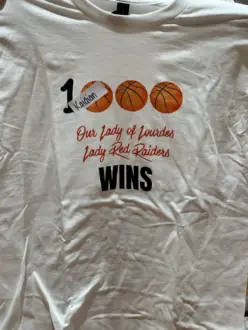 Lourdes players and coaches pose with ballons and wear commemorative T-shirts celebrating the program's 1,000th win after beating Tri-Valley on Thursday night (Photo by Leroy Boyer).