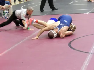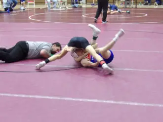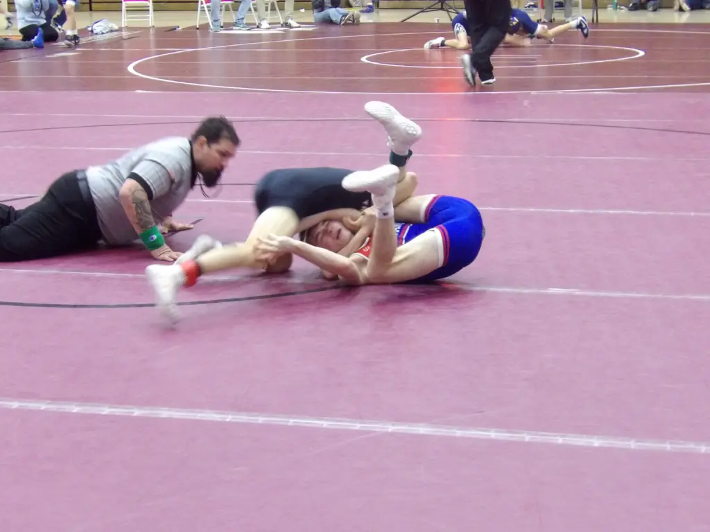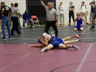 Leading off the finals at 107, Wolfgang got locked up in a spirited flurry against North Schuylkill’s Gaige Mentusky. Eventually, Wolfgang gained leverage and turned the corner for the takedown. As he did, he locked up a near-side cradle and stacked Mentusky for the fall in 1:25.