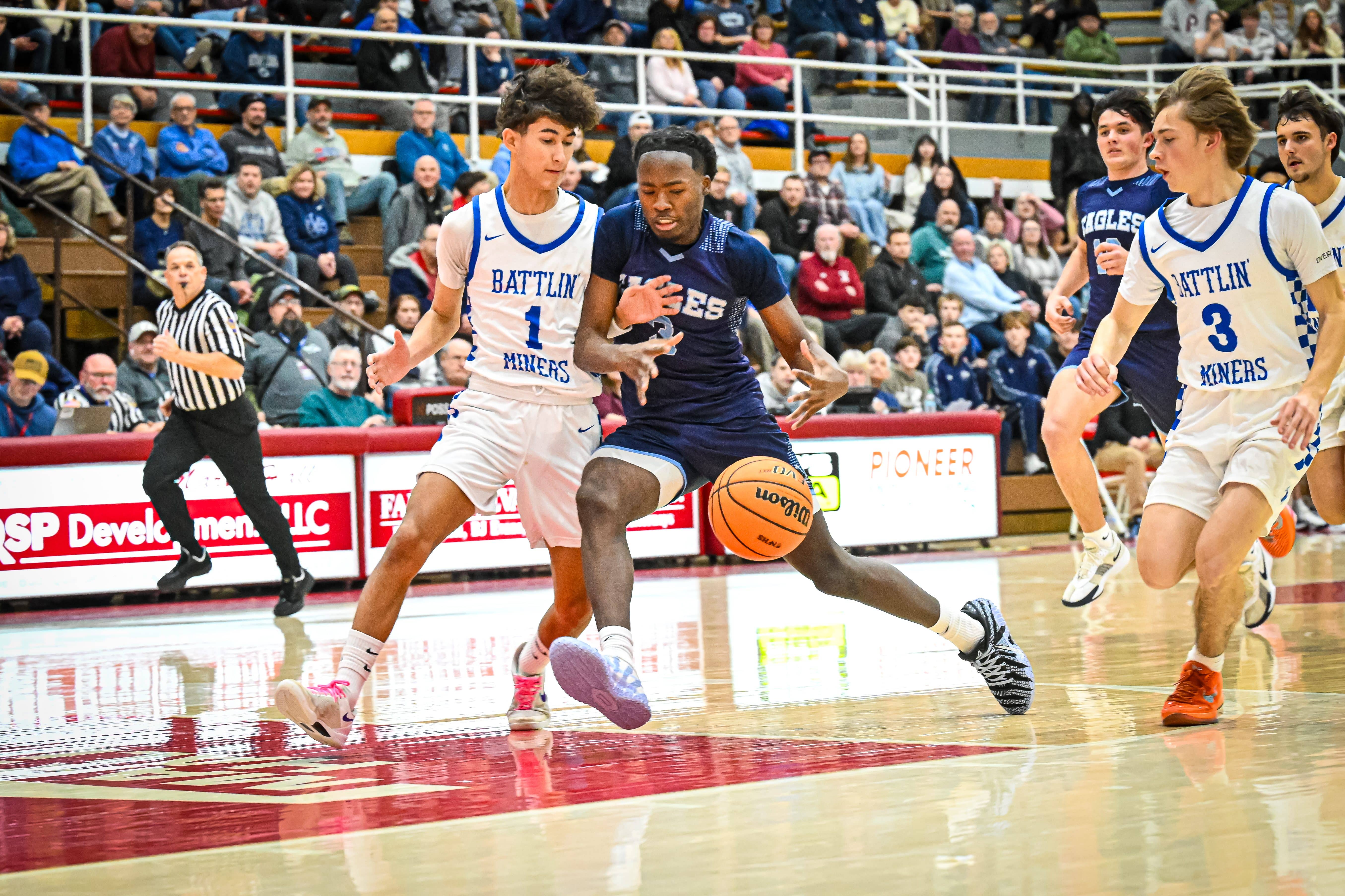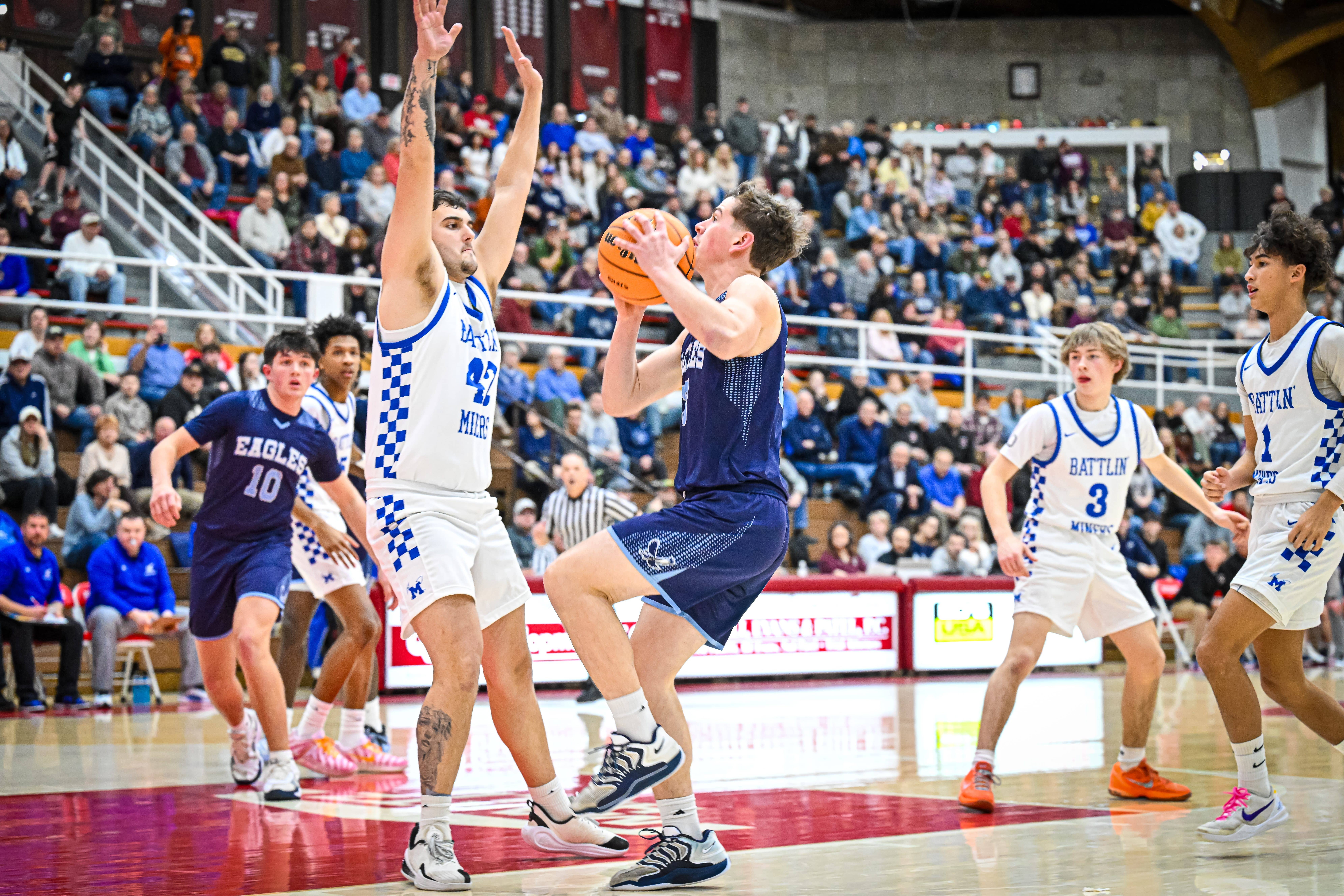 Cohen Werner opened the scoring with a strong finish inside, Cohen Kirby followed with a bucket in the paint, and Tyeirre Meade began cooking early. A deep Meade 3 and another by Evan Setlock pushed the Eagles in front 18-6 late in the first quarter before a Camden Rogers 3-pointer for the Miners just before the buzzer cut the deficit to 18-9.