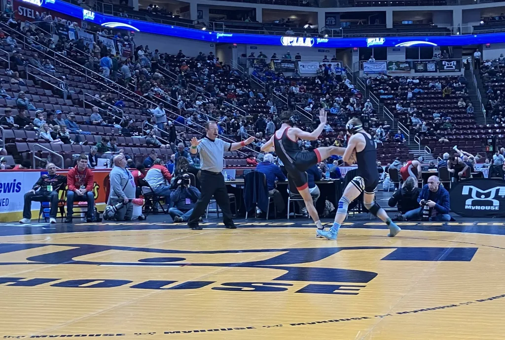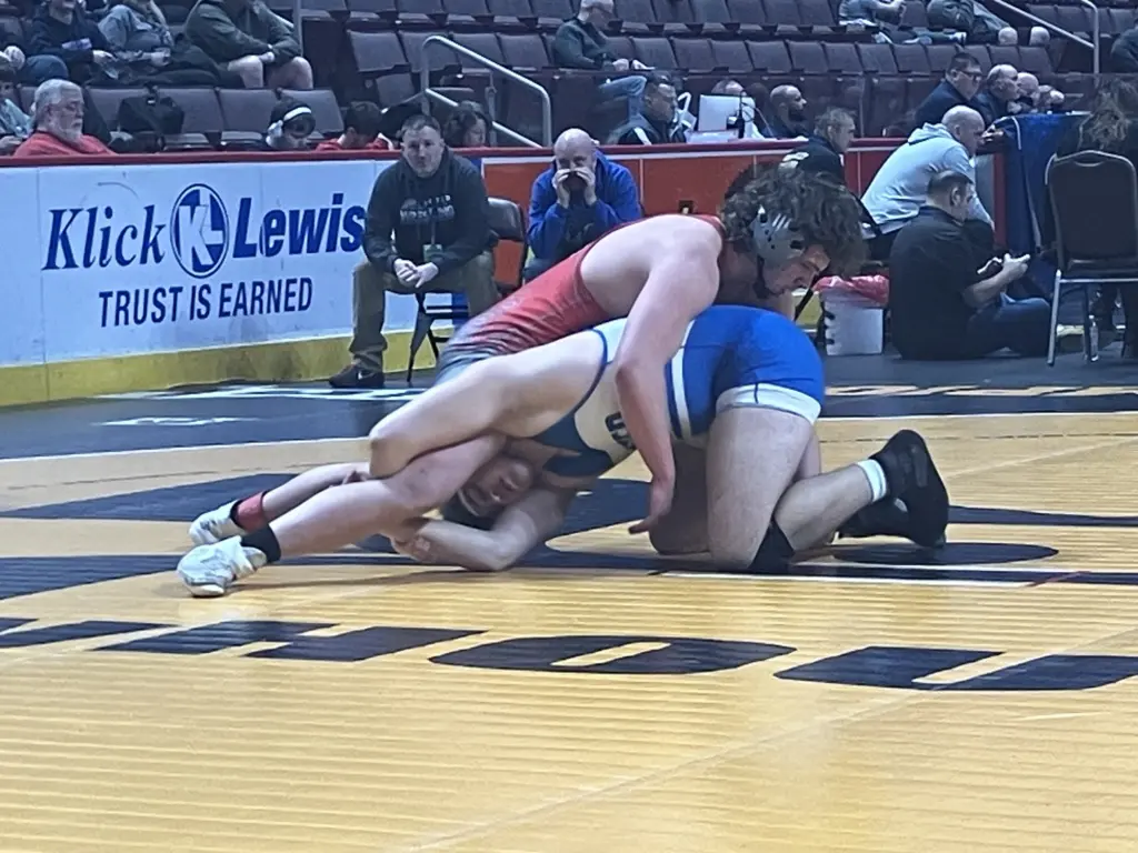Tri-Valley's Owen Wolfgang, top, pins Burrell's Carl Thomas in a 107-pound preliminary bout at the PIAA Class AA Wrestling Championships on March 5, 2026, at the Giant Center in Hershey. (Photo by Bob Lipsky)