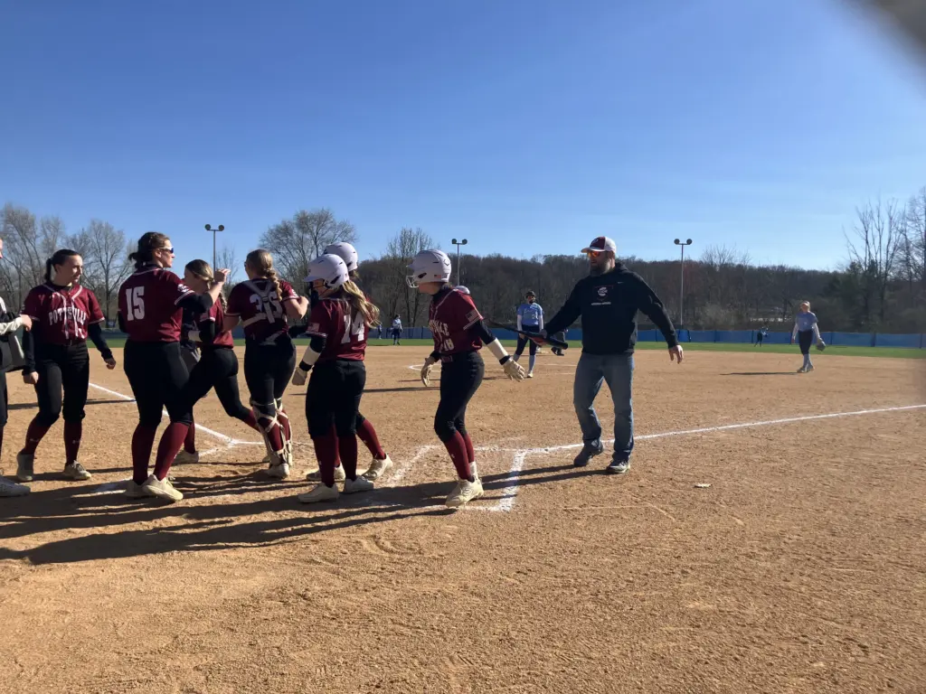 Pottsville’s players greet Jes Siminitus at home plate after she hit a two-run home run in the third inning against Blue Mountain on April 7, 2026, at Patton Field. (Photo by Bob Lipsky)