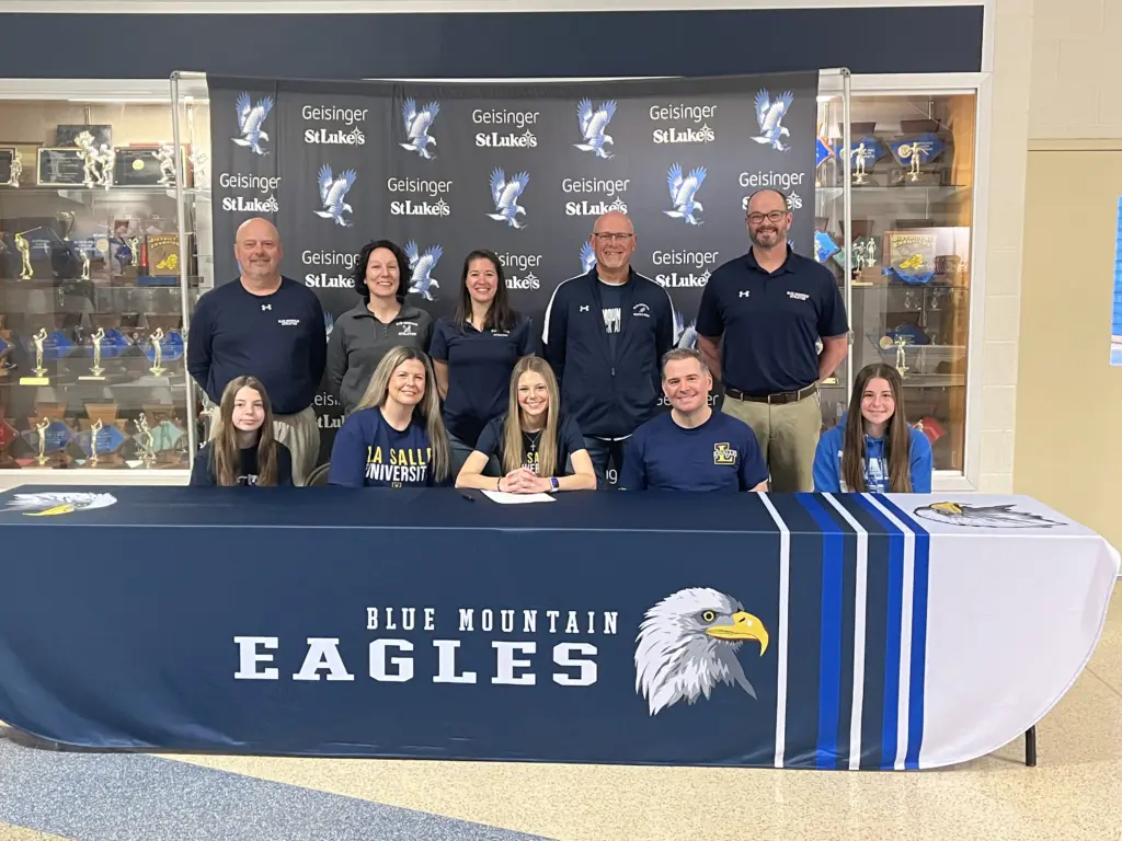Blue Mountain senior Gianna Chipriano has signed a letter of intent to continue her academic and track and field and cross country careers at La Salle University. She will major in Biology. Those taking part in the ceremony include, front from left: Joey Chipriano, sister; Tammy Chipriano, mother; Gianna Chipriano; Joe Chipriano, father; and Olivia Chipriano, sister; back from left: Doug Morgan, athletic director; Rose Carper, assistant athletic director; Paige Lurwick, track coach; Tom Kanger, cross country coach; and Eric Schaeffer, principal. (Photo courtesy of Blue Mountain Athletics)