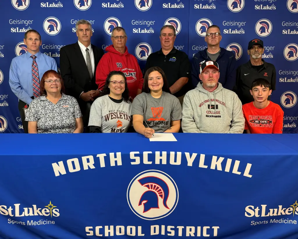 North Schuylkill senior Jordanna Frie signs a letter of intent to continue her academic and softball careers at West Virginia Wesleyan. Pictured, front from left: Carol Abalo, grandmother; Amanda Abalo, mother; Jordanna Frie; Jonathan Frie, father; and Wyatt Frie, brother; back, from left: Dr. Robert Ackell, superintendent; Ken Roseberry, principal; Larry Domalakes, Frackville Fury coach; Jack Flynn, North Schuylkill head softball coach; Jim Gross, athletic director; and Sal Abalo, grandfather. (Photo courtesy of North Schuylkill Athletics)
