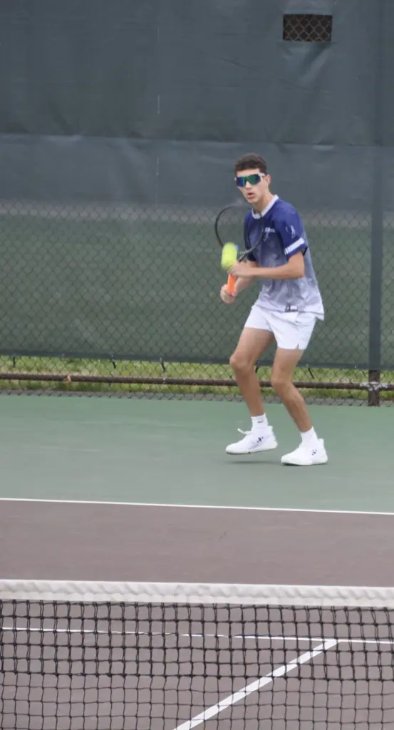 Blue Mountain's Camren Watters hits a forehand during a District 11 Class AA Doubles Tournament match April 28, 2026, at Lehigh University. (Photo courtesy of Blue Mountain Athletics)