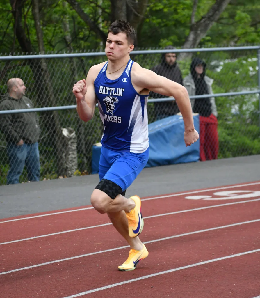 Blue Mountain's Chase Guers wins the boys' 100 meters during Tuesday's Schuylkill League Division I track and field meet at Minersville (Photo by Brook Koch-Guers).